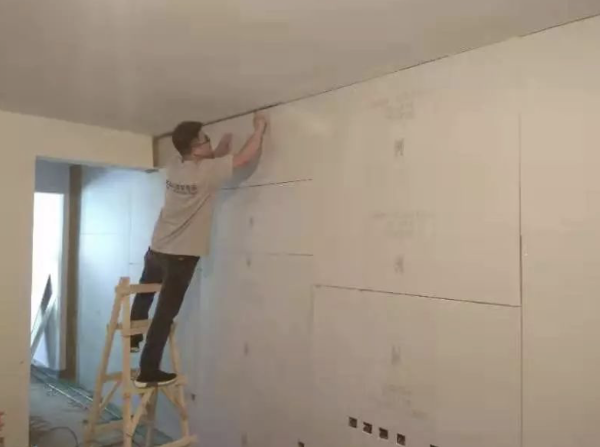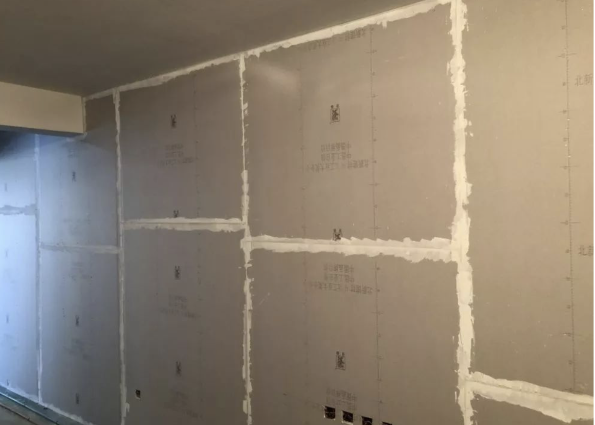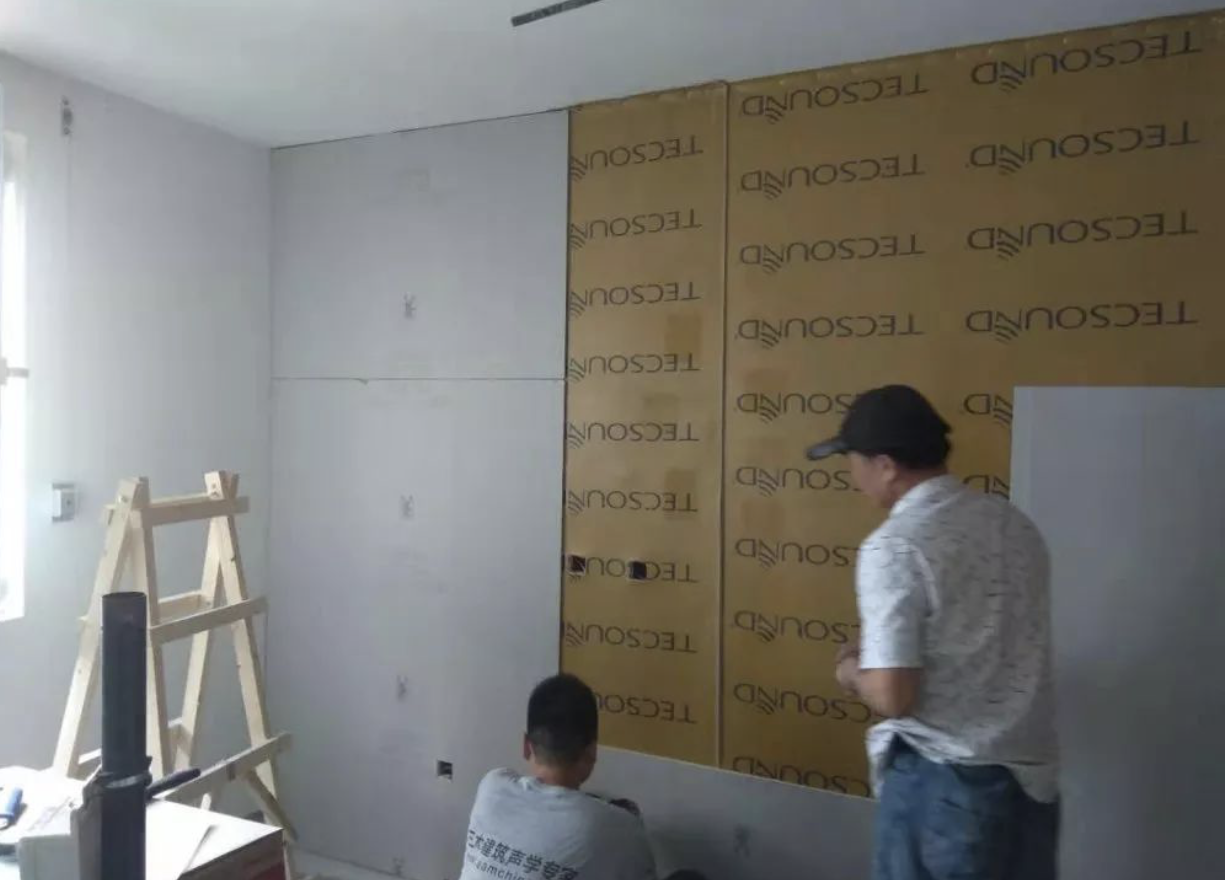 清理墙面和四周→铺装第一层隔音毡→安装9.5mm石膏板→缝隙处理→铺装第二层隔音毡→安装12mm厚石膏板(完成)