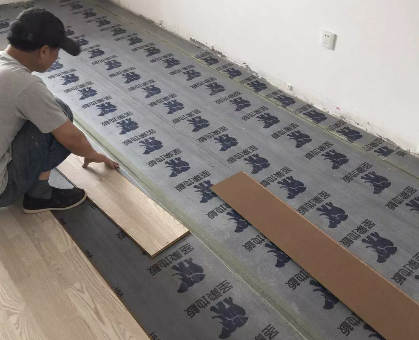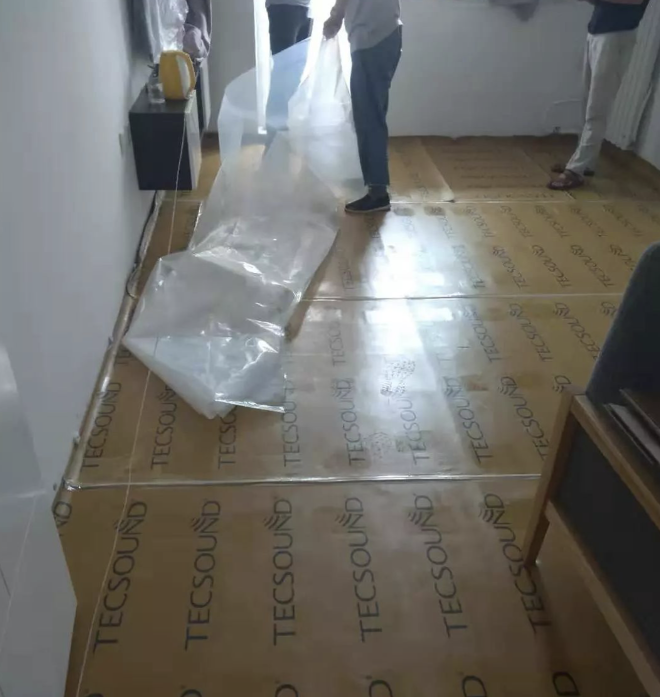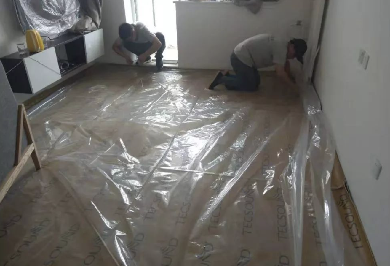 铺装隔音毡后,我们需要做一层塑料膜,有利于防潮,隔离等效果,并防止隔音毡和地板产生粘结等,同时延缓隔音毡老化等功效。
